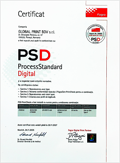 Certificarea de proces FOGRA, garanteaza respectarea celor mai exigente cerinte pe tot parcursul procesului de print digital, de la setarea parametrilor fisierului grafic, masurarea colorimetriei pentru obtinerea de culori constante pentru tot tirajul si de la un job la altul, calibrarea corecta a printer-ului digital si pana la controlul de calitate final. Obtinerea unui nivel constant al culorilor si calitatii la nivel profesional, reprezinta o prioritate pentru noi astfel incat sa putem garanta reproducerea corecta a culorilor PANTONE. Acest aspect atat de important pentru companiile ce isi doresc respectarea culorilor de brand pe toate materialele, a fost urmarit prin obtinerea certicarii de proces atat pentru printul digital pe materiale rigide, a printului digital in rola cat si a deja clasicului printului digital in coala. Am obtinut certificarea FOGRA in 2019 si treptat a urmat traseul standard de reinoire, asfel incat sa avem la zi cea mai ravnita certicare tipografica la nivel World Wide, ca dovada de bune practici, ca o garantie a calitatii si nu in ultimul rand ca o confirmare a nivelului tehnic si de know-how cu privire la procesele de proiectare / productie. Certicarea FOGRA in sine reprezinta prezentarea la cel mai exigent examen, promovarea acestuia si obtinerea astfel a garantiei ca poti capabil sa faci ceea ce spui ca poti face.